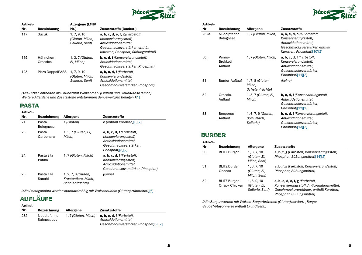 Das Geschäft verwendet gegebenenfalls Zutaten und Zusatzstoffe für Speisen und Getränke, die Allergien und Unverträglichkeiten auslösen können. Wenn du allergisch auf Lebensmittel reagierst, raten wir dir, dich telefonisch mit dem jeweiligen Betrieb in Verbindung zu setzen, um sich über verwendete Allergene zu informieren, bevor du eine Bestellung aufgibst.