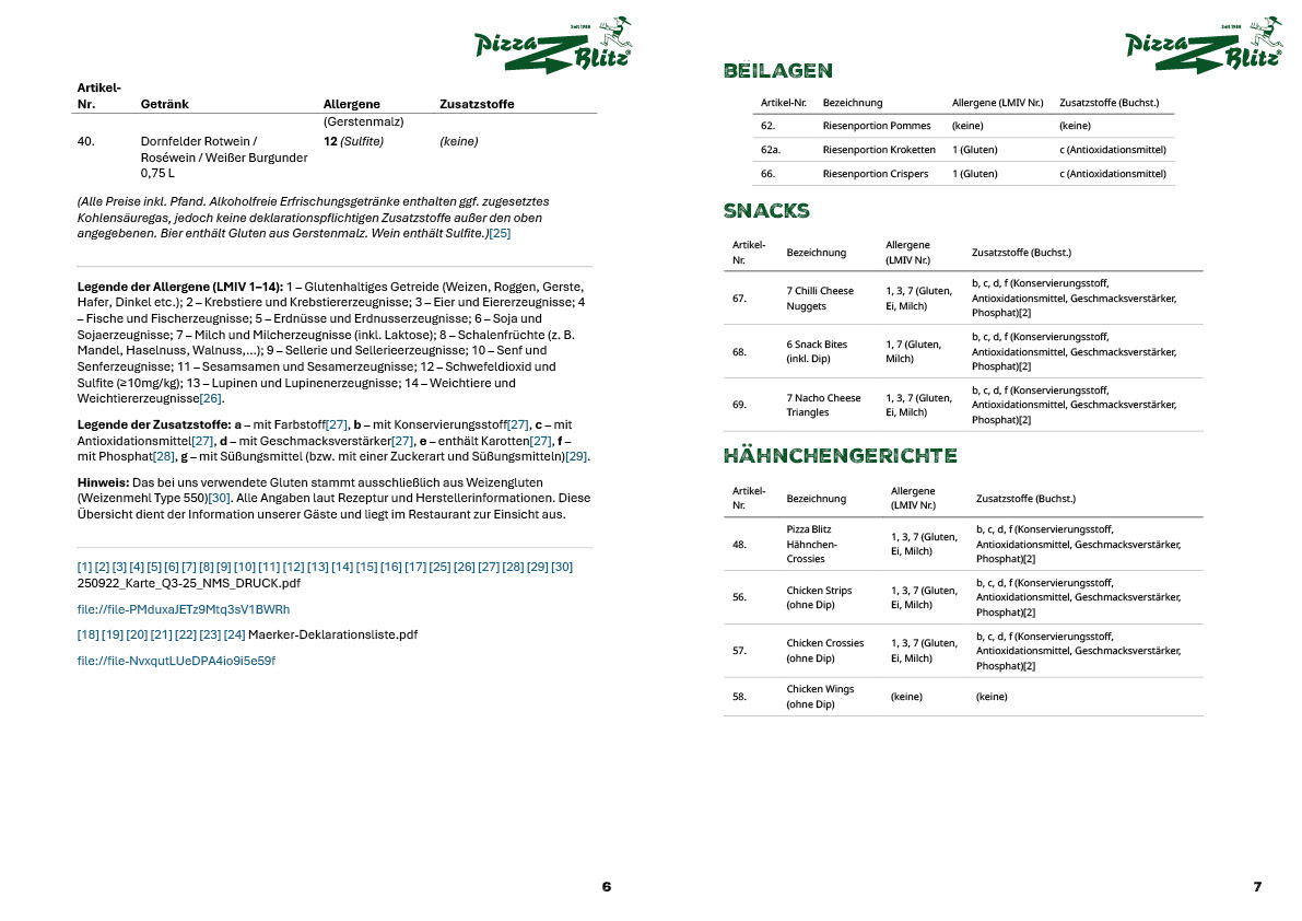 Betriebsinfos: Informationen über das Geschäft und seine Kontaktmöglichkeiten, die Produkte und der Service, die im Rahmen des Angebots zur Verfügung gestellt werden (einschließlich z. B. Allergene, Nährwertangaben und Inhaltsstoffe), Preise für jedes einzelne Produkt (einschließlich Mehrwertsteuer), Firmenlogo, Grafiken, Liefergebiet (einschließlich Angabe der Postleitzahlen), Lieferkosten und Mindestbestellmengen sowie sonstige Information zum Betrieb.
